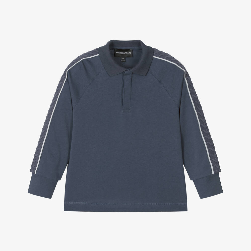 A slate blue polo shirt for boys from Emporio Armani, made in soft cotton. The jersey fabric is designed in a heavier weight for a cool, sleek drape. This long-sleeved top is trimmed with embossed Eagle branding; the Italian label's iconic artwork. Classic polo elements include the pointed collar and front button-fastening placket, which is hidden for neatness.