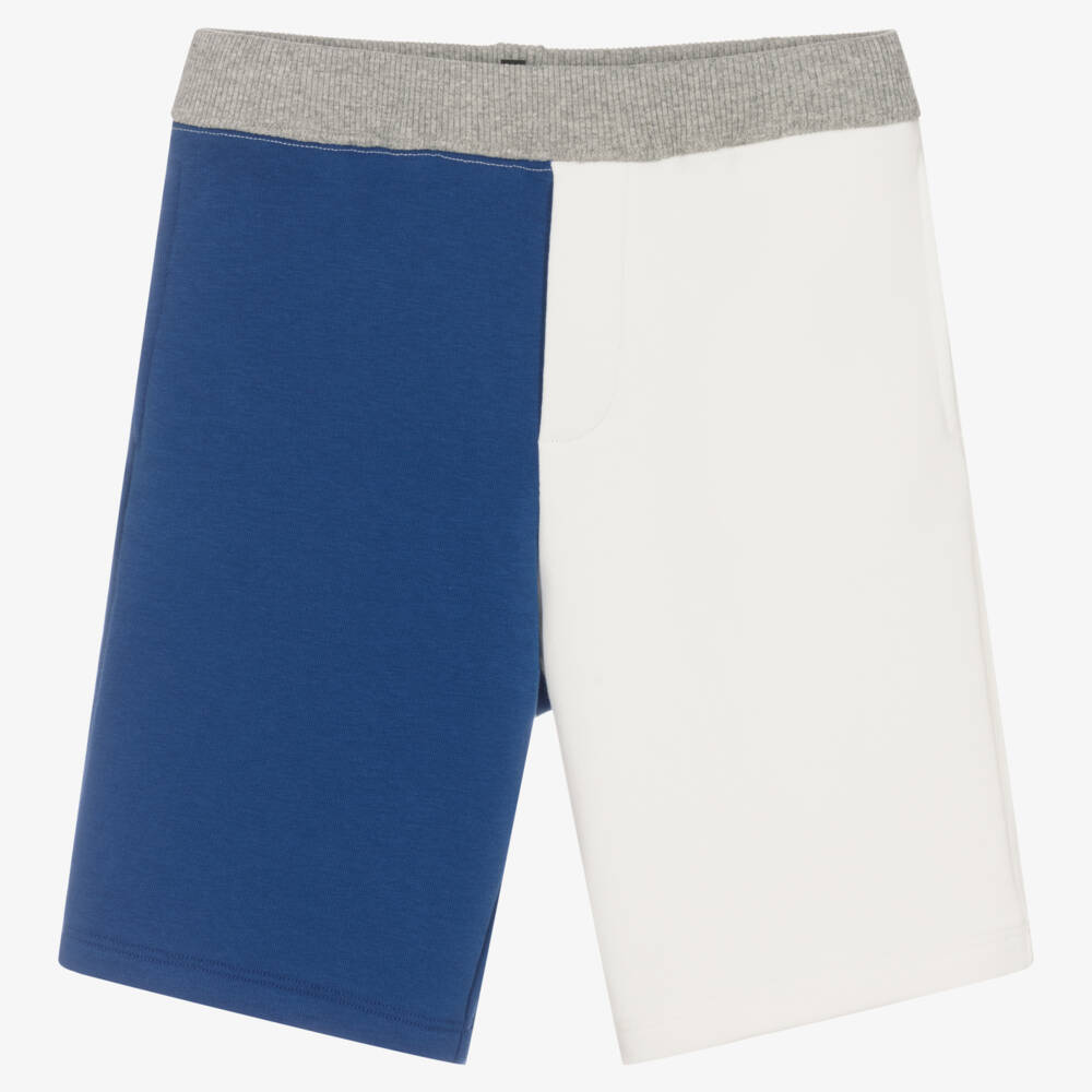 Blue and ivory colourblock shorts for boys from Emporio Armani, with a contrast signature Eagle logo print on the back. Casual and comfortable, they are made in soft cotton-blend sweatshirt jersey and have an elasticated grey ribbed waistband for easy pull on. There are useful concealed side pockets and a pocket on the back.