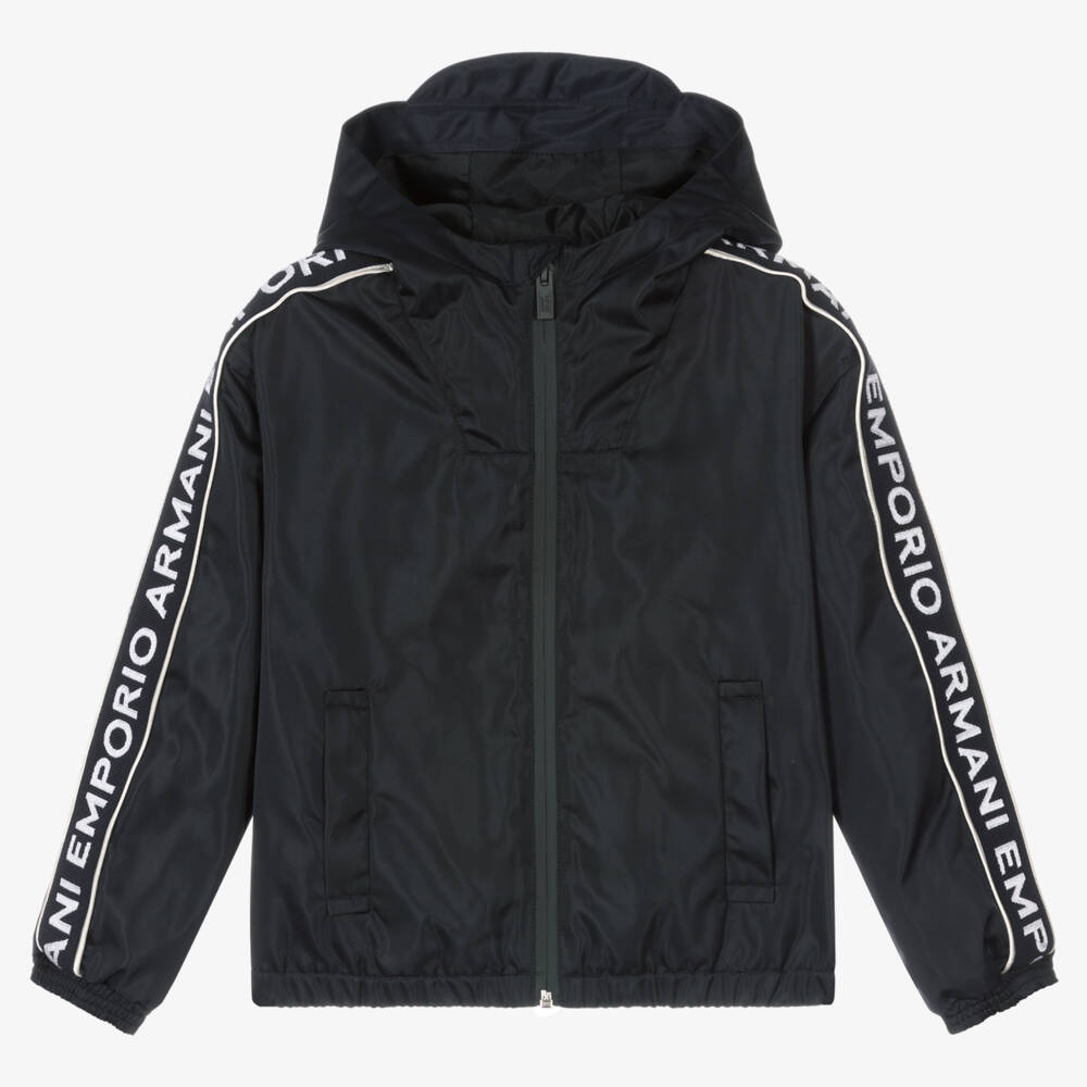 Navy blue hooded jacket for boys by Emporio Armani, with statement logo tape down the sleeves. Silky smooth and water repellent, it is made in smooth and silky recycled fabric with a lightweight lining. For extra protection against the rain and cold, the front zip fastening is taped, and the cuffs and hem are elasticated. There are popper fastening front pockets and a branded zip pull for a finishing designer touch.