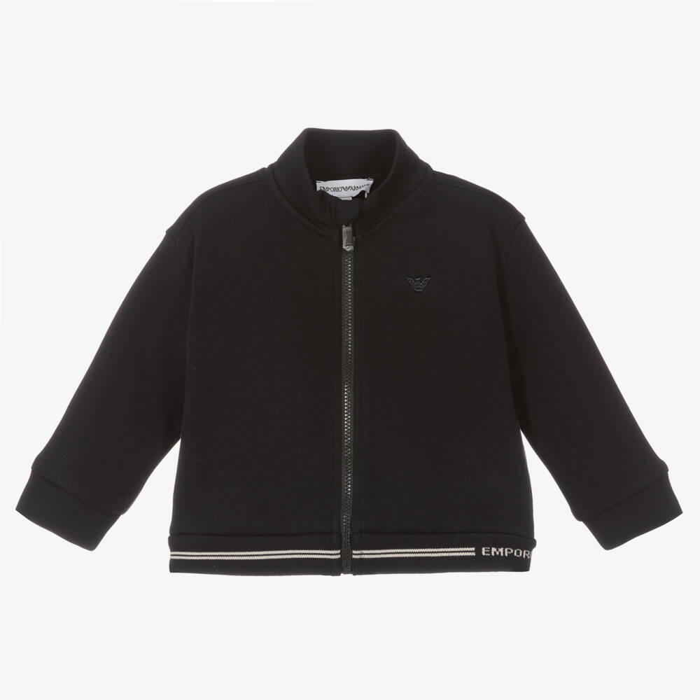 Sporty navy blue cotton blend zip-up top for little boys by iconic Italian brand Emporio Armani. Made in lightweight, comfortable, Milano jersey, it has the designer's signature Eagle logo embroidered on the chest and a white intarsia logo and stripes on the elasticated hem. The zip fastening has a branded pull and a useful chin guard for protection.
