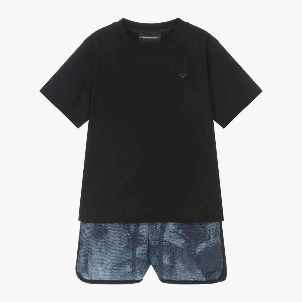 Navy blue shorts set for boys by Emporio Armani, made in soft organic cotton jersey for casual dressing. The crew neck T-shirt has short sleeves and a raised Eagle logo on the chest to distinguish the brand. The paired shorts have a cool palm tree print with the same branding on one leg. They have an elasticated waist and concealed side seam pockets. Sleek navy blue trims and curved split hems give this piece a sporty feel.