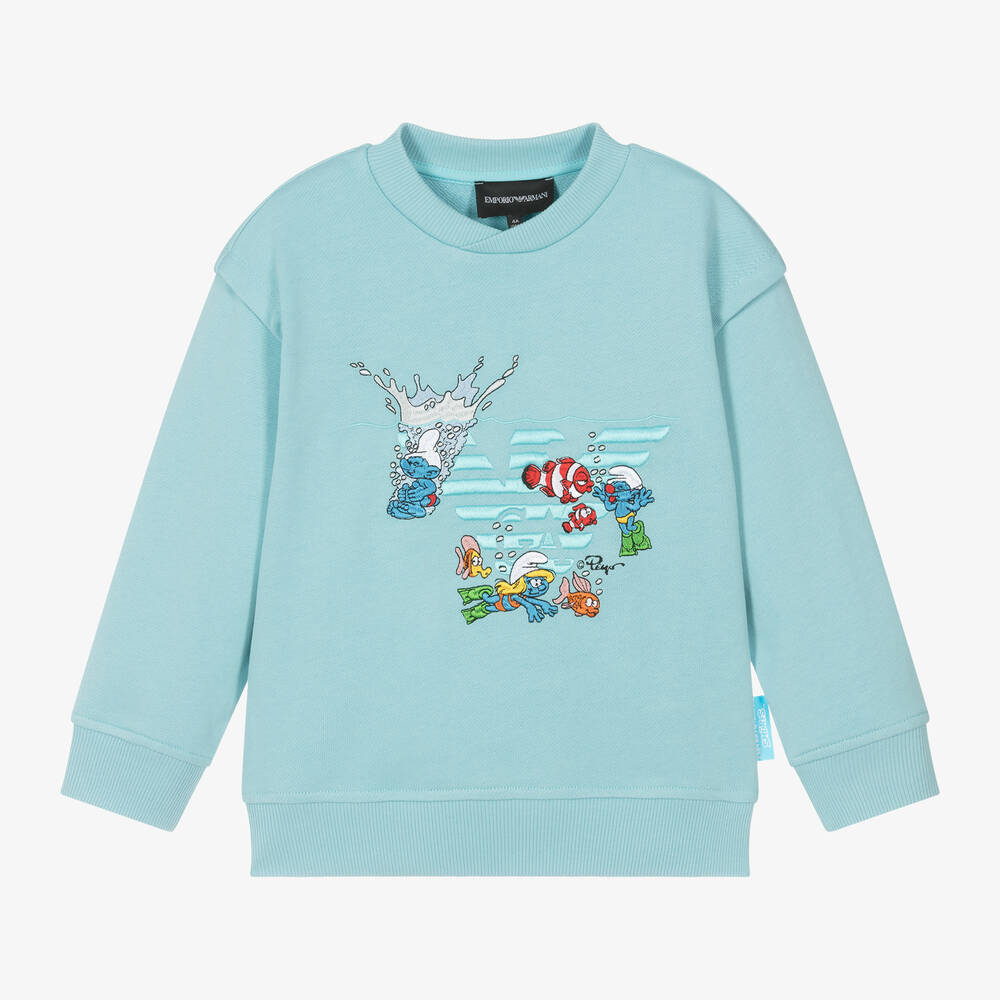 Pale blue sweatshirt for boys by luxury Italian brand Emporio Armani, made in comfortable mid-weight organic cotton jersey. It has a fun embroidered design on the front featuring the iconic Eagle logo and loveable Smurf characters, with an under-the-sea theme. For a stylish finish, the shoulders have pleated seam detail and the top has a cross-over ribbed crew neck. A branded tab on the side seam completes the look.