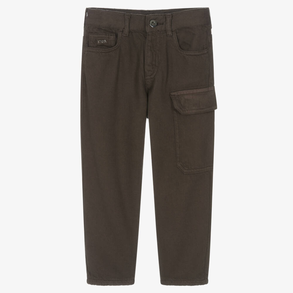 Dark brown cargo trousers for boys by Emporio Armani, woven in soft organic cotton. This five-pocket style has a metal EA logo on the front and a distinct Eagle motif affixed on the back. There is a handy cargo pocket on the leg to keep essentials within reach. An adjustable waistband, belt loops and a neat button and zip fastening complete this casual design.
