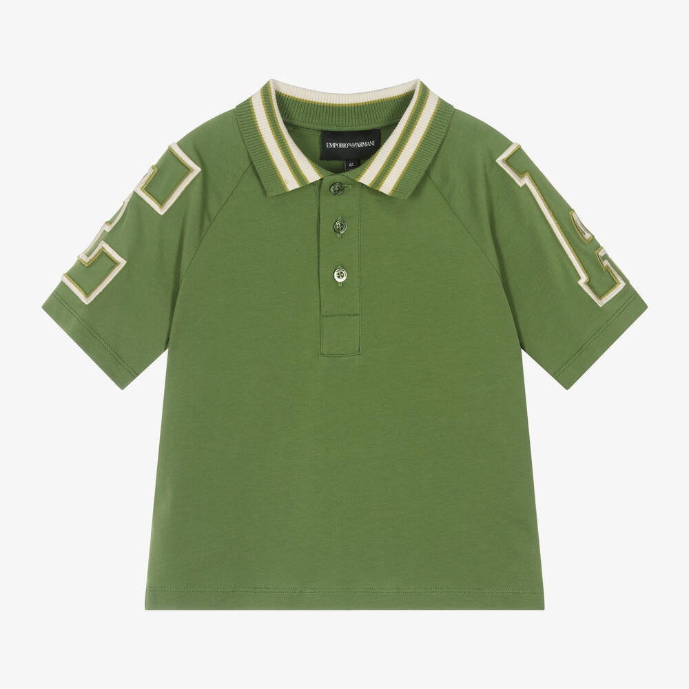 A cool green polo shirt for boys by Italian brand Emporio Armani. It is made in soft and comfortable cotton jersey in a boxy, relaxed fit. The casual styling features a ribbed collar and the EA logo initials boldly embroidered on the raglan short sleeves in an ivory and green theme. It fastens with branded buttons on the front.