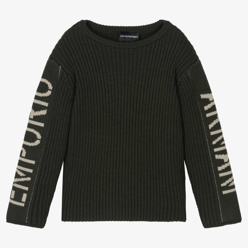 Dark green sweater for boys by Emporio Armani, in a soft ribbed knit. For a bold designer statement, it features beige logo lettering down each sleeve. Made in a luxuriously soft wool blend, this cosy and comfy top is a great addition to his winter wardrobe.