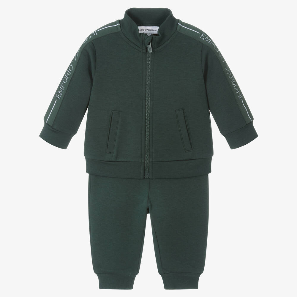 Green tracksuit for little boys from Emporio Armani, made in soft double jersey. The zip-up top has front pockets and a stand-up collar with a protective chin guard. It has jacquard tape trims on the sleeves with the brand's classic Eagle logo. The joggers have a matching logo tape elasticated waistband with gently ribbed cuffs for comfortable wear.