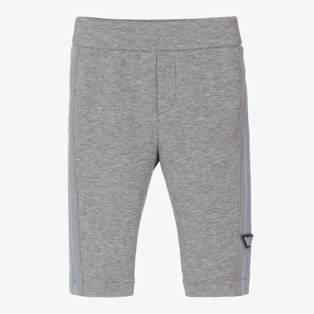 Grey cotton-blend trousers for little boys by Emporio Armani. They have blue striped trims and the brand's signature rubberised Eagle logo. Cosy and comfy to wear, they are made in soft double-sided jersey, with a gently elasticated waistband for a good fit.