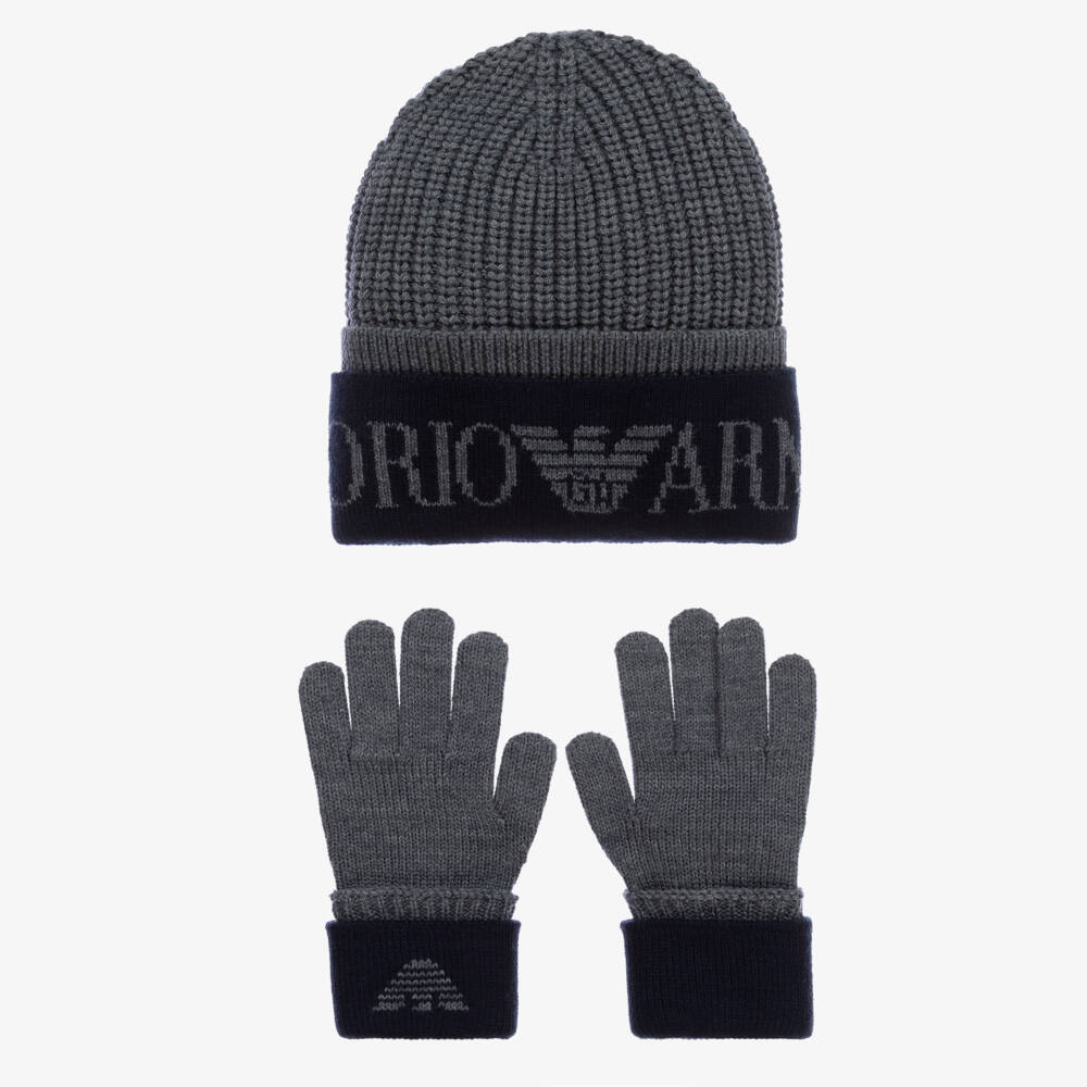 Cosy and warm, grey and navy blue beanie hat and glove set for boys by luxury designer Emporio Armani. Softly knitted in a chunky virgin wool mix, both pieces feature the brand's signature Eagle logo on the navy blue trim for instant designer appeal.