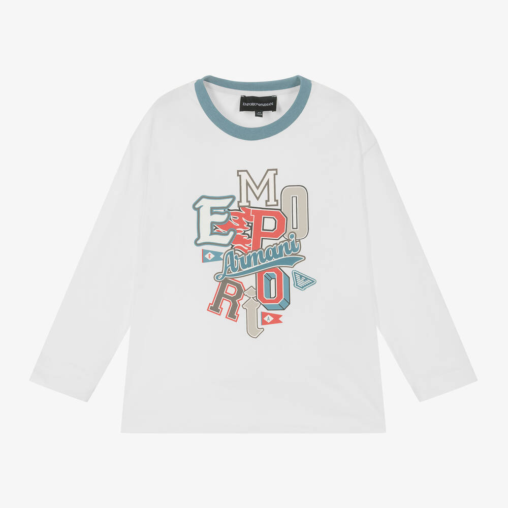An ivory cotton long-sleeved top for boys by Emporio Armani, with a contrasting blue crew neck. There are cool varsity-inspired logo prints on the front in red, blue and beige, featuring the iconic Eagle logo for a stylish designer look. It is made in soft jersey, ideal for comfortable casual wear.