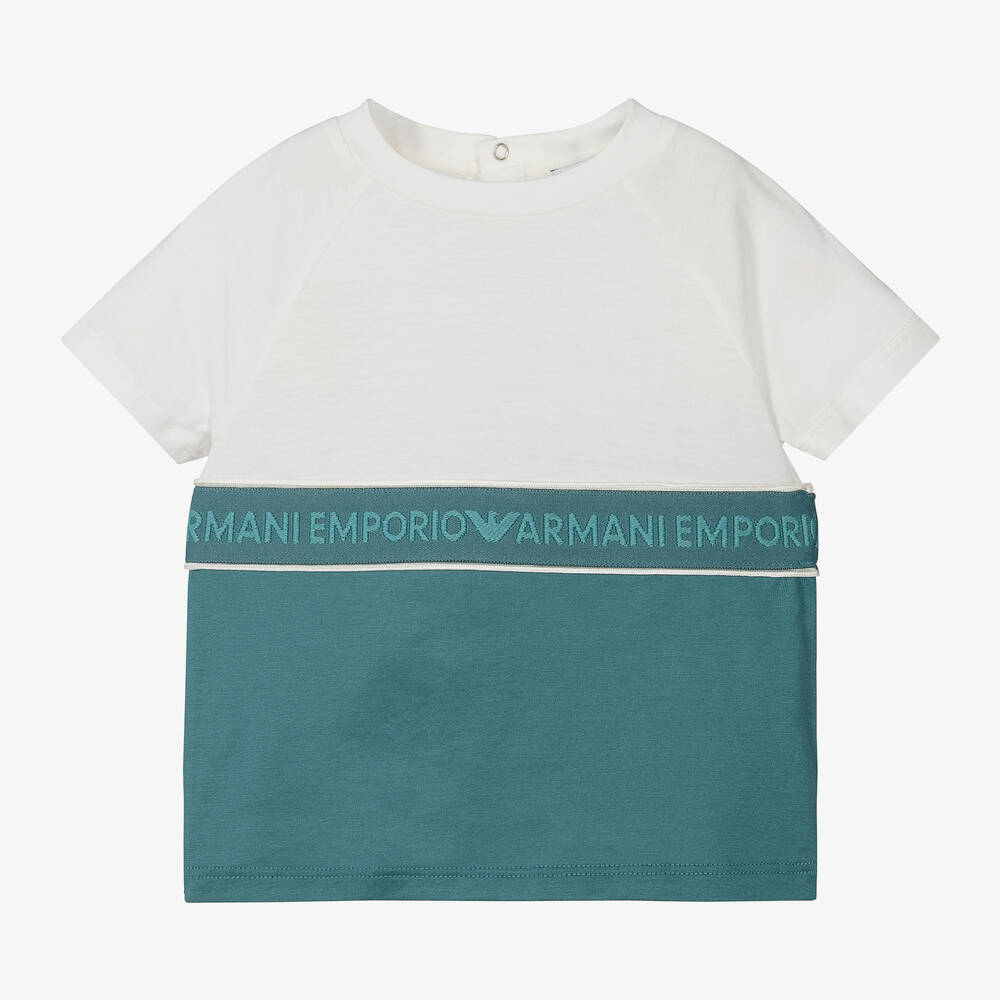Stylish colourblock T-shirt for little boys by luxury Italian label Emporio Armani, in ivory and teal green. Made in a soft lyocell and cotton blend jersey, it has raglan sleeves and a jacquard band around the middle with a repeat logo design. There are branded popper fastenings on the back for easy, over-the-head dressing.