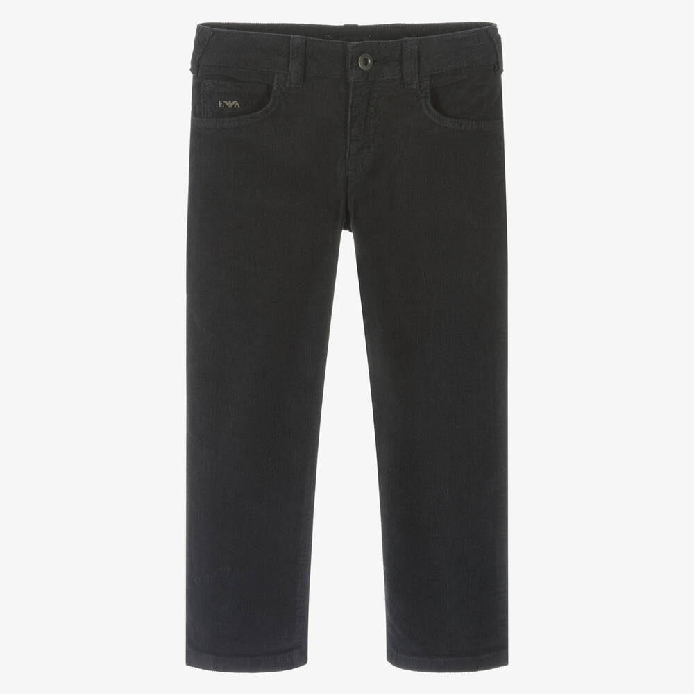 Navy blue trousers for boys by Emporio Armani, made from soft and velvety cotton corduroy. Simply styled, they have a gunmetal Eagle logo on one back pocket and a coordinating Emporio Armani logo on the front for a distinctive finish. Designed with plenty of pockets, they fasten with a zip and branded button and have an adjustable waist on smaller sizes for a comfortable fit.