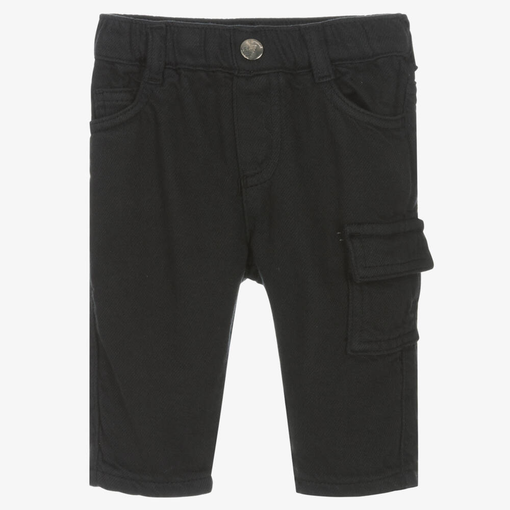 Dark navy blue cargo trousers for little boys by Emporio Armani, woven in soft organic cotton. Great for casual styling, they have five-pocket detailing and an additional flap pocket on the leg. There is a metal EA logo on the back and further branding on the decorative front button. The elasticated waist ensures a comfortable fit and feel on tiny tummies.