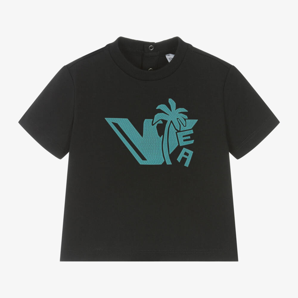 Dark navy blue T-shirt for younger boys by Emporio Armani. It has a pale blue, textured silicone Eagle logo, incorporating a palm tree for a cool, tropical look. Made in comfortable cotton jersey, this casual short-sleeved tee fastens with poppers on the back for easy dressing.