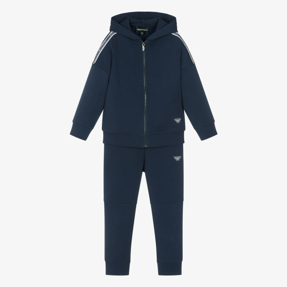 Navy blue hooded tracksuit for boys by Italian brand Emporio Armani, made in luxury soft cotton-blend jersey. Both pieces have iconic Eagle patches and logo tape trims for a signature look. The top has a front zip fastening, with a branded zip puller. The joggers have concealed side seam pockets, cuffed ankles, and an elasticated waist with a faux drawstring detail.
