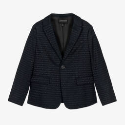 A dark navy blue blazer for boys from Italian fashion house Emporio Armani, made in a soft wool and viscose blend. This tailored design offers understated luxury thanks to jacquard Emporio Armani branding. Styled with notched lapels and three front pockets, it is lined with silky fabric for comfort and fastens with a logo-engraved button on the front. Three button trims on each sleeve complete this smart look.