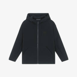 Navy blue zip-up hoodie for boys by Emporio Armani, made in soft, mid-weight jersey. Casually stylish, it features the brand's iconic Eagle logo in a jacquard design, with a tonal rubberised logo patch on the chest for instant brand recognition. There are useful pockets on the front and it fastens with a branded zip.