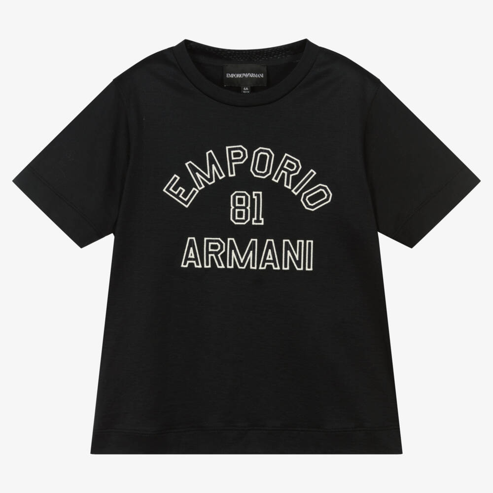 Boys dark navy blue T-shirt by Emporio Armani, made in super soft lyocell jersey. Lightweight and easy to co-ordinate, it has an embroidered, varsity style, appliqué logo on the front in white.