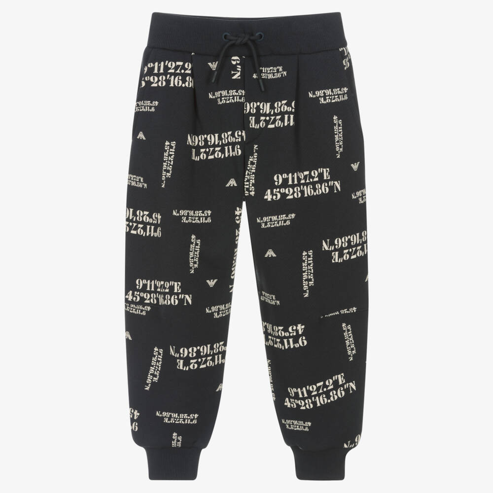 Dark navy blue joggers for boys by Emporio Armani, made in soft organic cotton jersey. They are patterned in an all-over coordinates print, incorporating the designer's signature Eagle logo, for a subtle designer touch. Comfortable to wear, they have ribbed cuffs and a gently elasticated waistband with a faux drawstring tie.