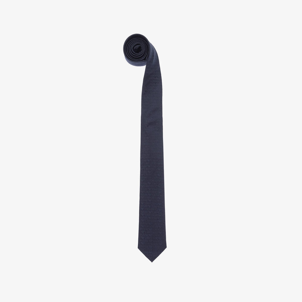 Sleek navy blue silk tie for boys by Italian brand, Emporio Armani. Adding a charming finishing touch to a smart outfit or suit, it is woven with a tonal blue jacquard logo and Eagle pattern for a signature look.