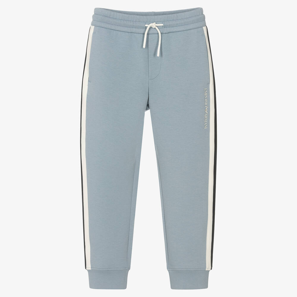 Effortlessly cool pale blue cotton joggers for boys by Italian brand Emporio Armani. With a comfortable drawstring waist, these soft bottoms have black and white stripes on the legs and a white Emporio Armani logo print on one side. There are also three useful slip pockets.