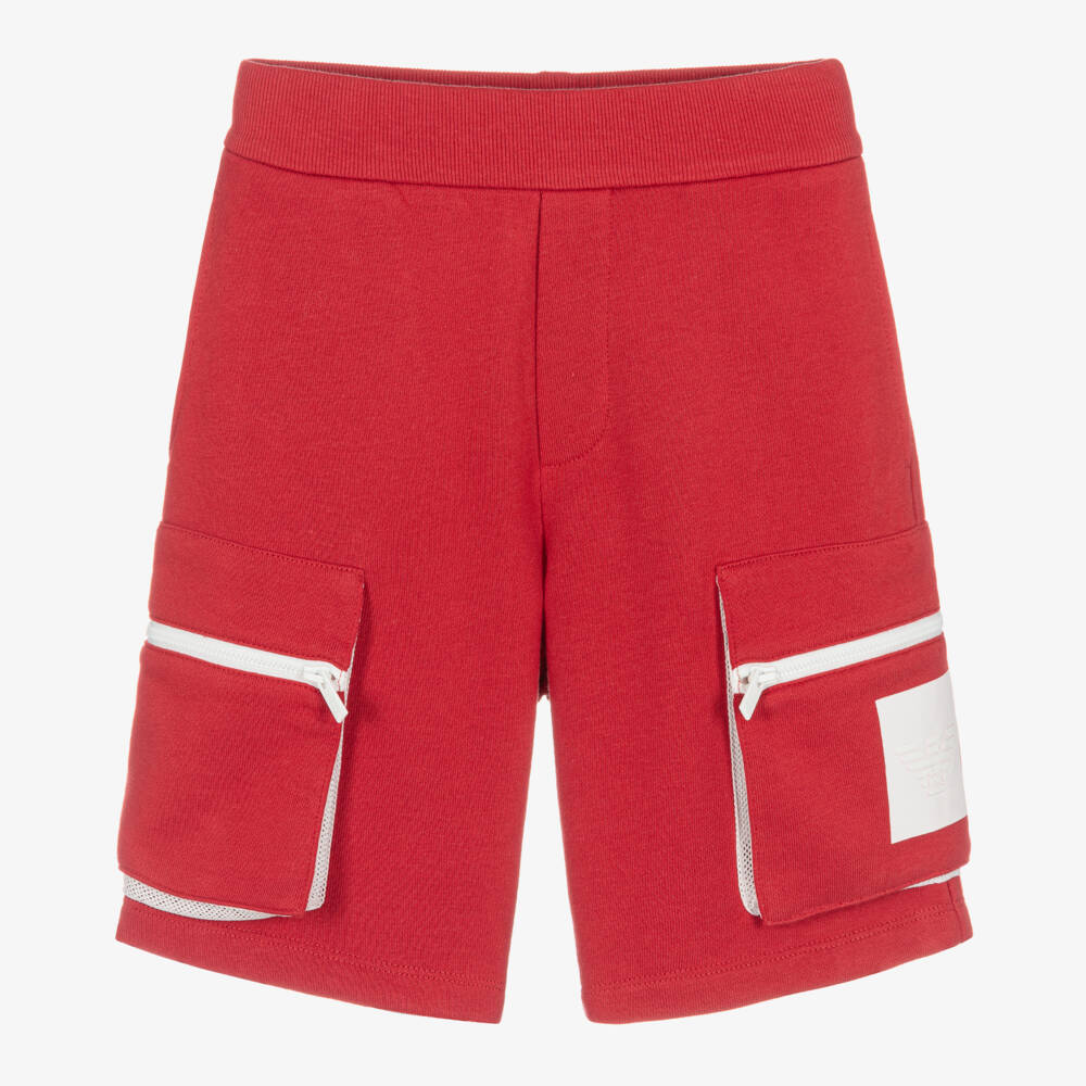 Casual red cargo shorts for boys from Emporio Armani, made in soft cotton sweatshirt jersey. They have concealed side pockets and zip-up patch pockets, with a white mesh trim, branded zips and a rubberised signature Eagle logo for a designer finish. The ribbed waistband is elasticated for comfort and easy pull on.