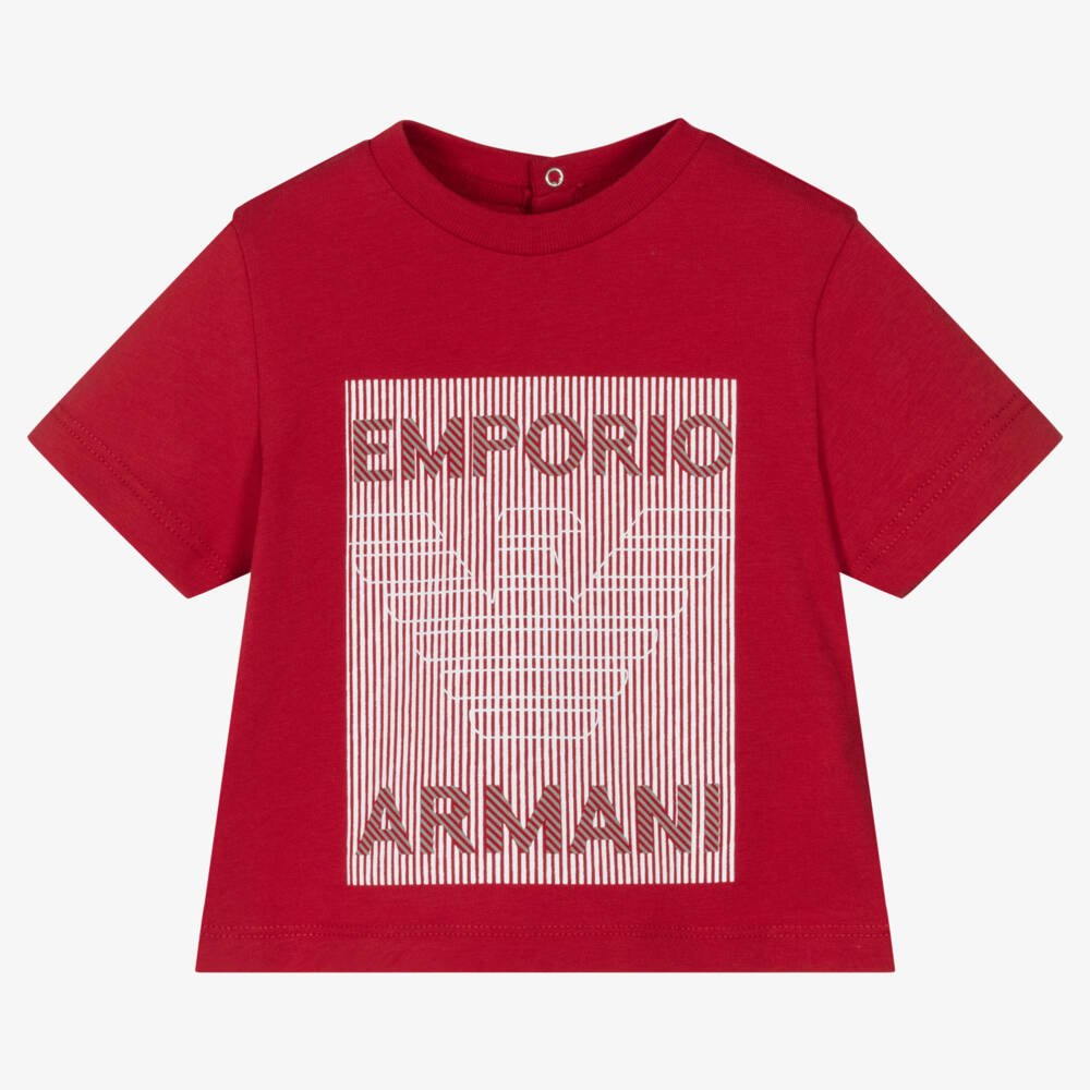 Red crew neck T-shirt for little boys by Emporio Armani. Made in soft cotton jersey, it has a cool white and red striped graphic on the front, with the brand's iconic Eagle logo. It fastens with logo-embossed poppers on the back for a finishing designer touch. This product contains organic and recycled fibres.