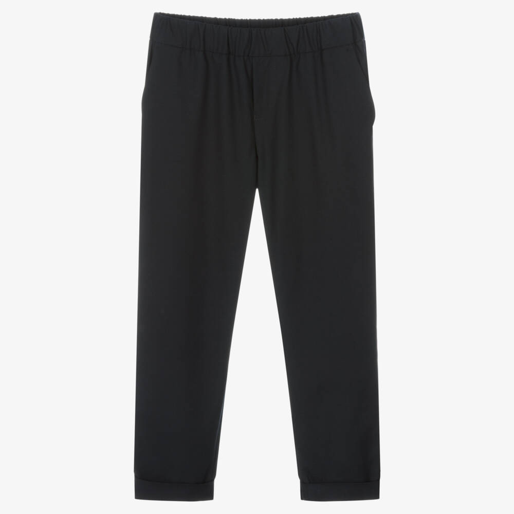 Smart navy blue trousers for boys by Emporio Armani, with an elasticated waistband for easy dressing. They are made in a soft viscose blend, with slanted front pockets, a button-fastening back pocket and turn-up cuffs. The brand's silver metal logo badge is on the back.
