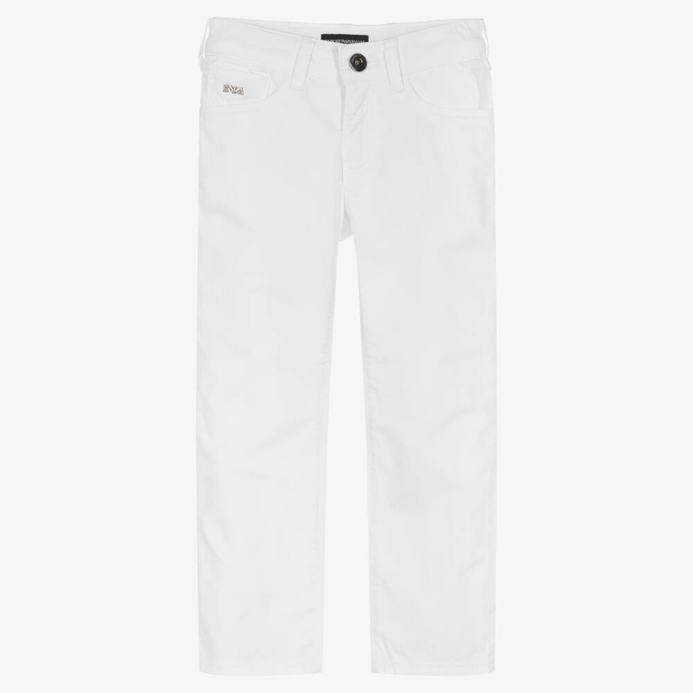 White trousers for boys by Italian brand Emporio Armani, made in smooth cotton. The designer's recognisable metal logo plate is on the coin pocket, with their signature Eagle metal logo on the back pocket. They are designed in a five-pocket jeans styling for a casual look. There is a comfortable adjustable waistband, with a branded popper and zip fastening. .