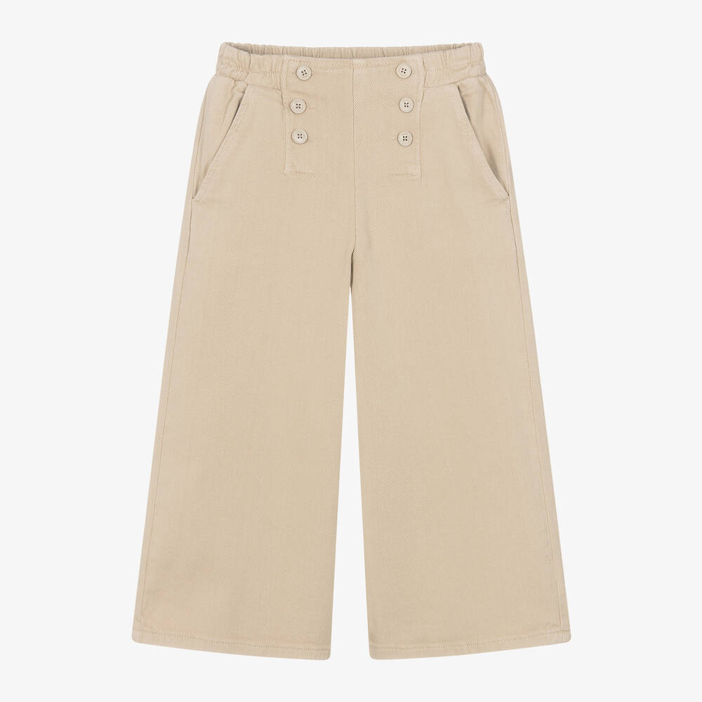 Beige trousers for girls by luxury Italian brand Emporio Armani, made in soft, mid-weight cotton twill. These casual but stylish wide leg trousers have slanted front pockets and branded button trims on the front. The waistband is elasticated for a comfortable fit.