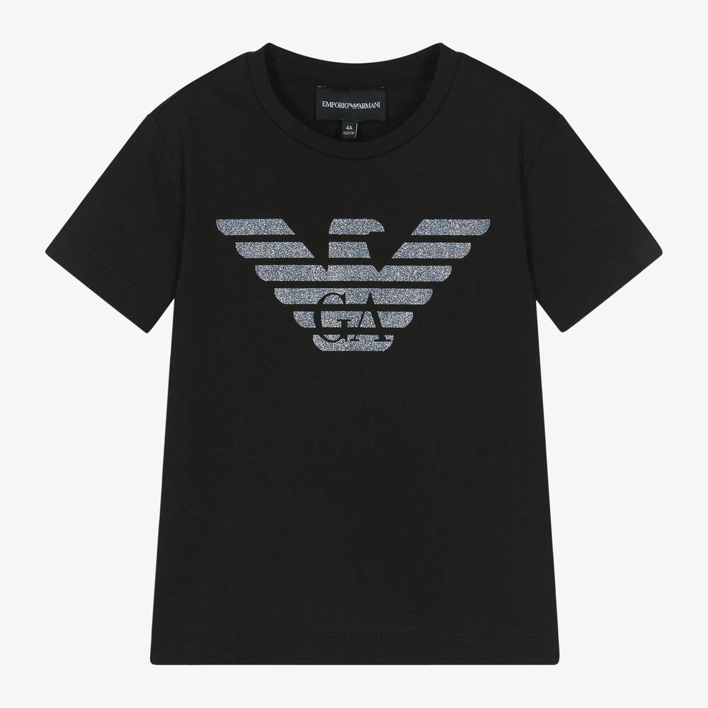 Black, short-sleeved T-shirt for girls by Emporio Armani. It is made from soft cotton jersey with a silver and pink glittery Eagle logo on the chest for a signature sparkly look.