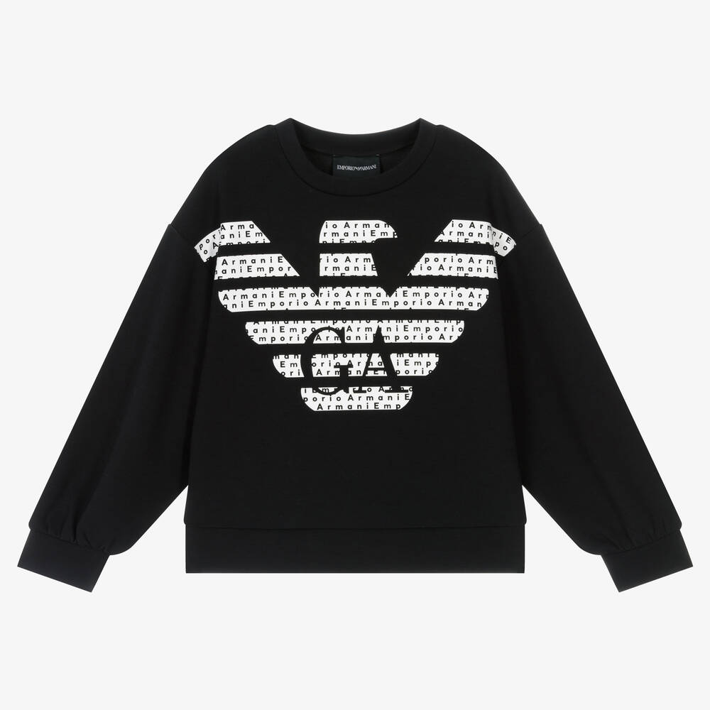 Black sweatshirt for girls by Emporio Armani, from the brand's EA Crew Collection. It features a stand-out white Eagle logo design on the front. Super comfortable to wear, it is made in a soft modal-blend jersey, in a relaxed oversized fit.