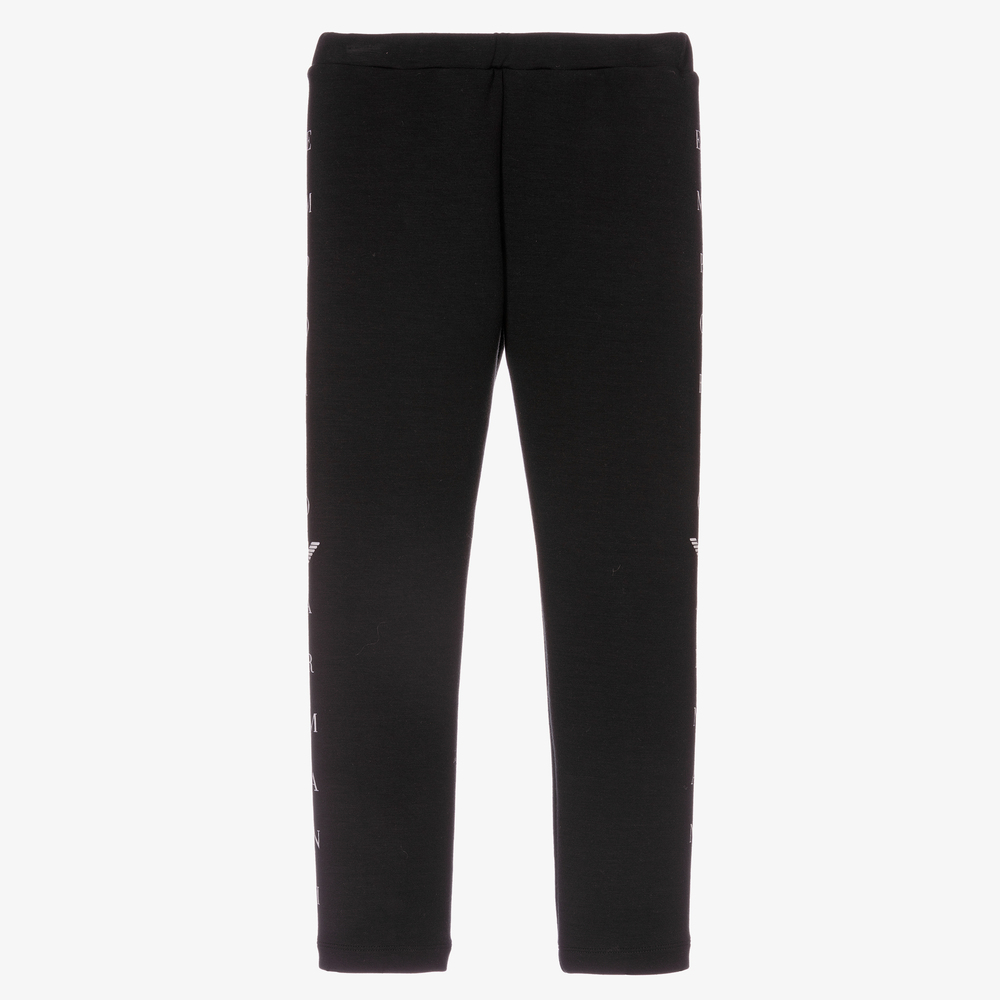 Girls black leggings by Emporio Armani, made in soft and stretchy modal polyjersey. As part of the EA Crew Capsule Collection, the legs are printed with the brand's logo in white.