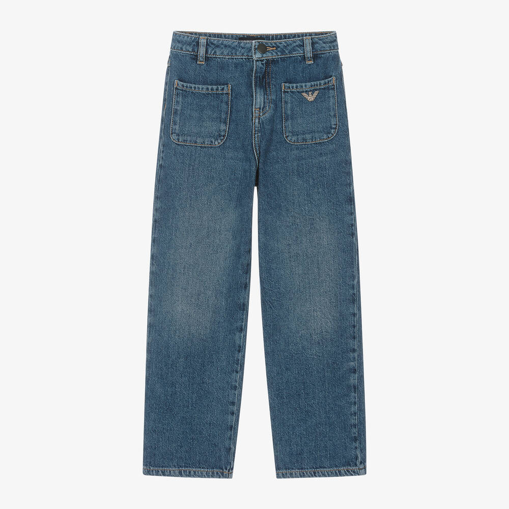 Blue jeans for girls by Italian brand Emporio Armani, made in soft denim. These Mom-style jeans have a high-waisted fit and classic orange stitching. There are patch pockets on the front, one with a metal Eagle logo for a subtle designer finish. These cool jeans fasten with a button and zip and have a useful adjustable waist.