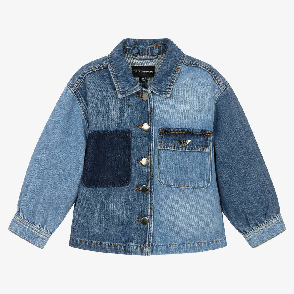 Stylish denim jacket for girls by Italian designer Emporio Armani, in contrasting shades of blue. Made from soft cotton denim, it has shirt styling for a chic update on a classic design. On the front, it has a patch pocket with a branded Eagle popper closure and a 'missing pocket' for a distressed casual look. Cut in a comfortable relaxed fit, logo-embossed button fastenings give a branded finish.