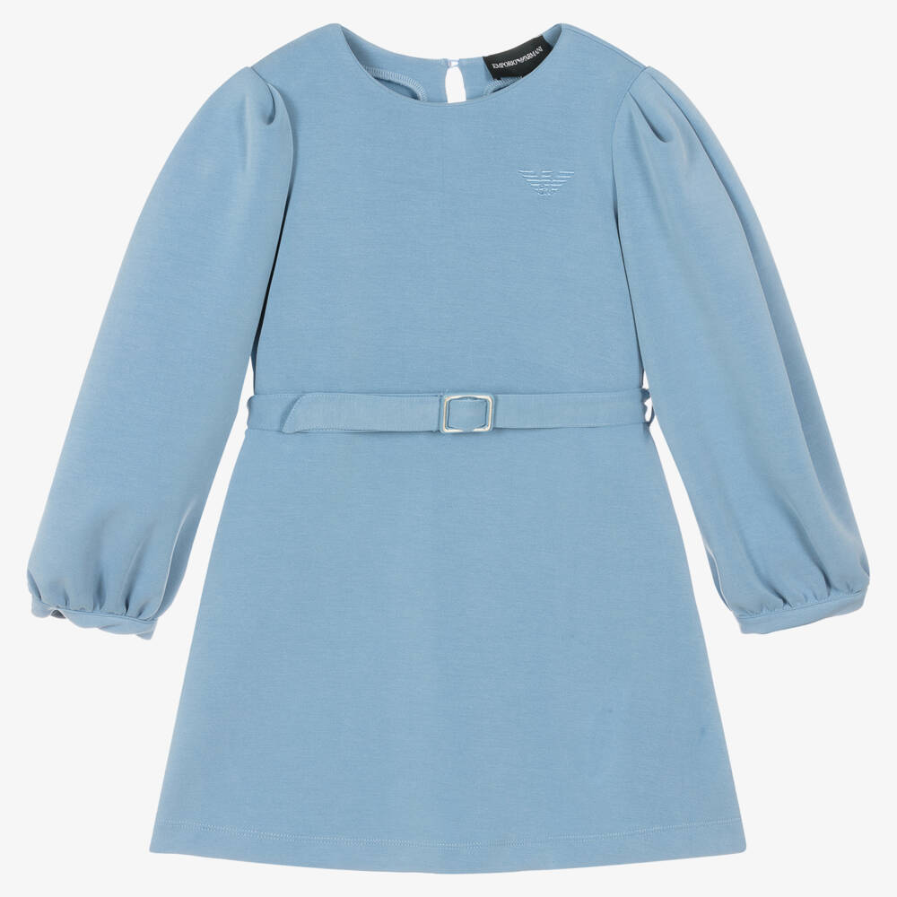 Dusky blue dress for girls by Emporio Armani, made from beautifully soft and stretchy fabric. Great for those smarter occasions, this understated piece has wide puff sleeves and a removable buckle belt around the waist. It has lightly gathered cuffs and a keyhole button fastening on the back. The brand's distinct Eagle logo can be seen on the chest in tonal embroidery.