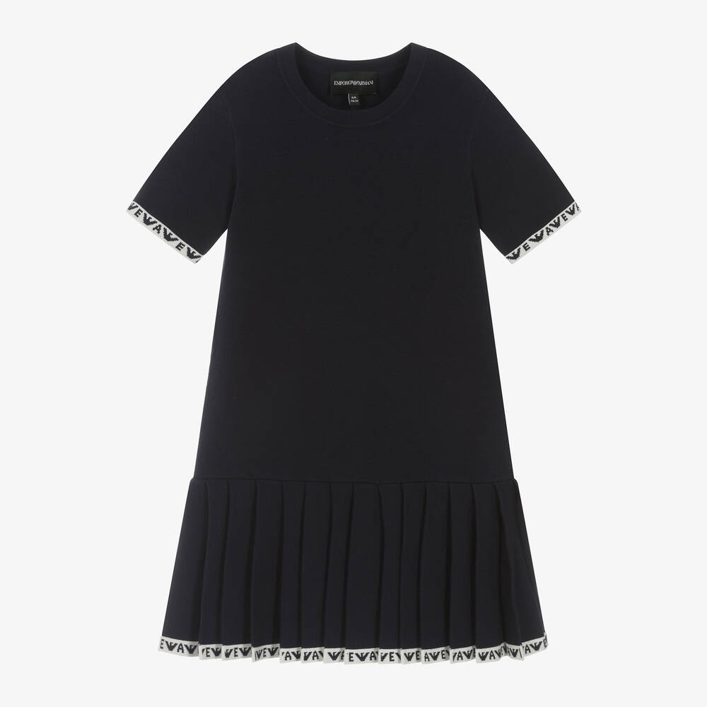 A smart navy blue dress for girls by luxury brand Emporio Armani. Made in a soft viscose jersey knit, it has a dropped waist and a pleated skirt. Adding a distinctive designer touch, the contrasting white hemline and cuffs have a repeat jacquard logo in navy blue. This stylish dress has a gently ribbed round neckline and slips on easily over the head.