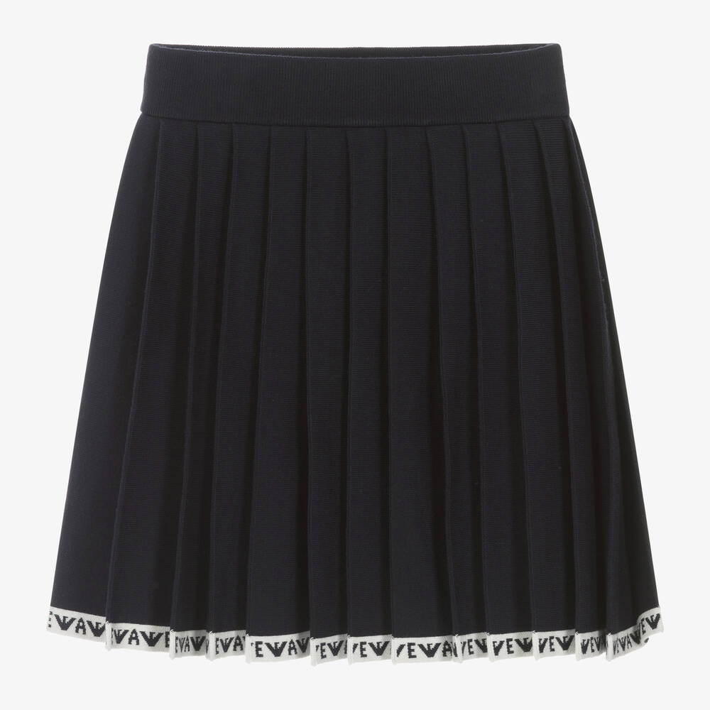 A smart navy blue pleated skirt for girls by luxury brand Emporio Armani. Made in a soft viscose jersey knit, this stylish design has a ribbed elasticated waist for comfort and easy pull on. Adding a distinctive designer touch, the contrasting white hemline has a repeat jacquard logo in navy blue.