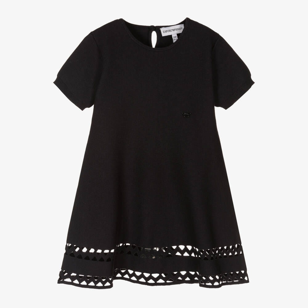 Gorgeous navy blue dress for little girls by Italian designer Emporio Armani. Made in super soft, lightweight Milano jersey, it has bands of pretty cut out zigzag detailing around the hemline and a signature Eagle logo badge on the chest. There is a neat keyhole button fastening around the back.