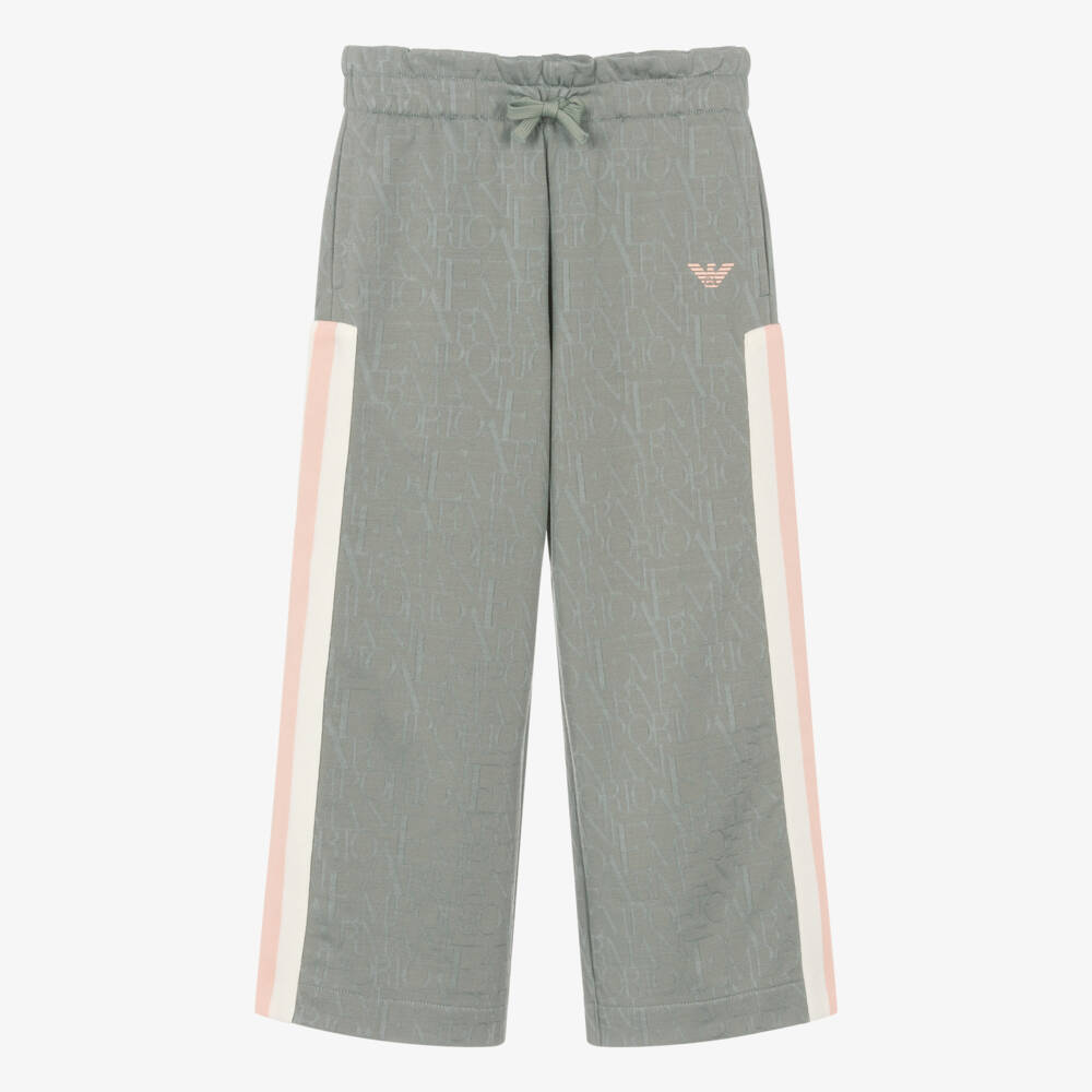 Light khaki green joggers for girls by Emporio Armani, patterned with a branded jacquard design. Made from soft jersey, these joggers have a cool wide leg fit with knitted tape trims in ivory and pale pink down each leg and useful side seam pockets. There is a pale pink rubberised Eagle logo on the front and a faux drawstring on the elasticated paperbag waist.