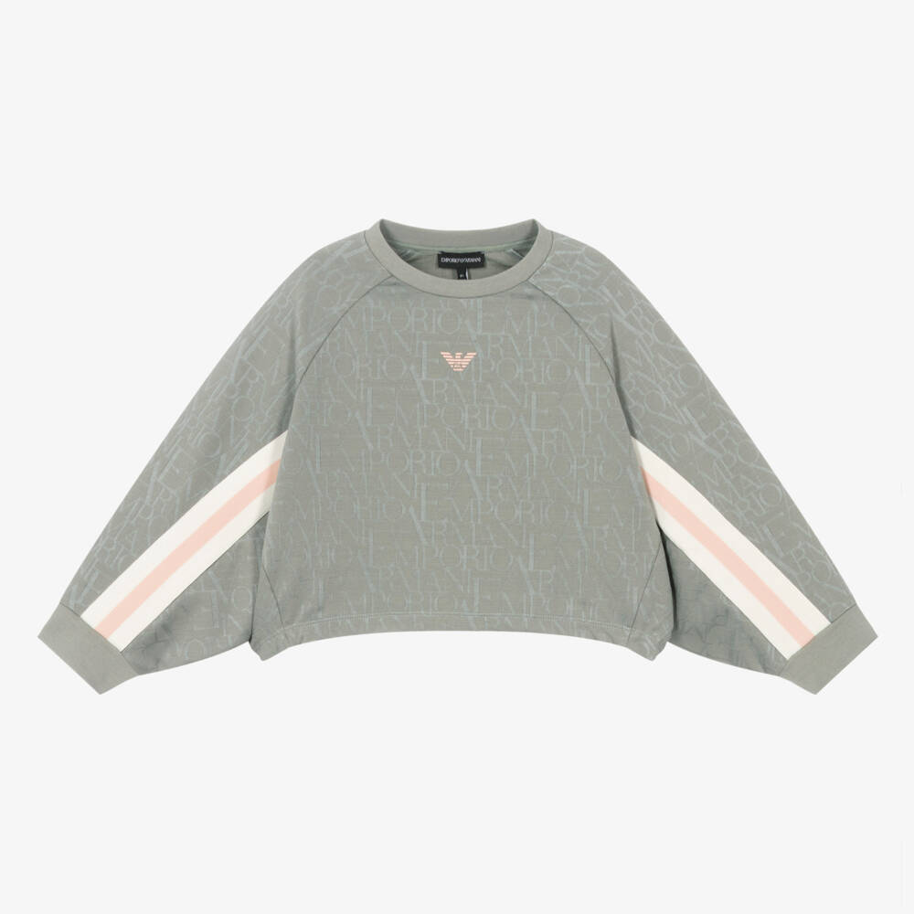 Patterned with a jacquard branded design, this light khaki green sweatshirt for girls is by Emporio Armani. Made from soft jersey, it has a cool boxy fit and batwing long sleeves with striped woven tape trims. There is a pale pink rubberised Eagle logo on the chest to complete the signature look.