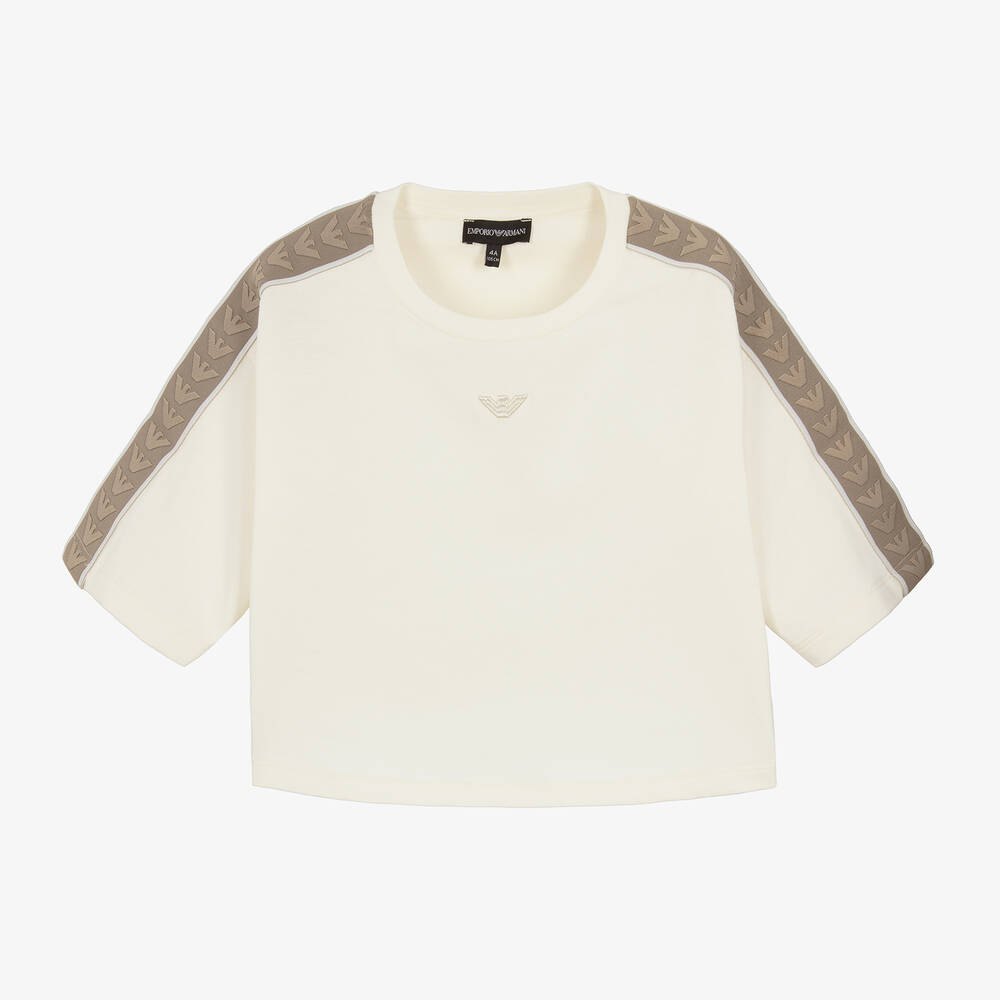 A relaxed, boxy fit T-shirt for girls by Emporio Armani in ivory. Made from soft cotton jersey, it is embroidered with a raised Eagle logo on the chest and has stretchy branded beige jacquard tape trimming the short sleeves for a distinctive finish.