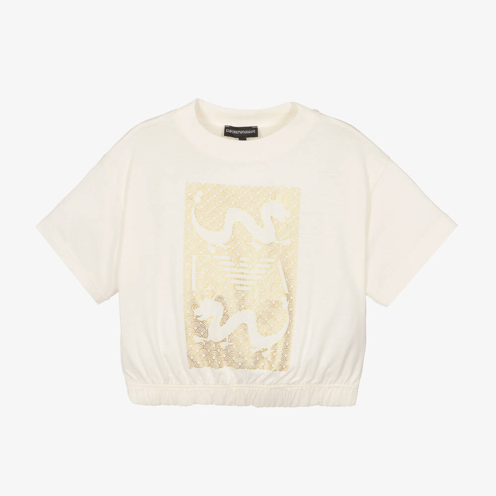 A T-shirt for girls by Emporio Armani, in ivory. Super comfortable, this luxuriously soft T-shirt is made in a mix of lyocell and cotton jersey. A design fit for Lunar New Year celebrations, it has a shimmering gold foil dragon and logo print on the front. This short-sleeved T-shirt has dropped shoulders and an elasticated hem for shape.