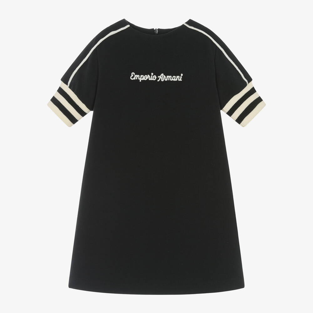 Casually styled, this navy blue dress for girls is by Emporio Armani. It is made from super soft cotton jersey, with an embroidered white logo on the chest and white velour piping along the short sleeves for a distinctive look. Fastening with a concealed zip on the back, it has wide ivory striped ribbed cuffs for a sporty finish.
