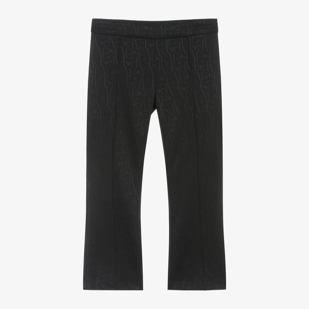 In a deep shade of navy blue, these smart trousers for girls are by Emporio Armani. They are made in soft jersey with a tonal jacquard logo pattern for a subtly branded look. Partially lined in lightweight viscose, they are designed with front seams and a silhouette that slightly flares towards the ankle. A concealed side zip fastening gives a neat finish.