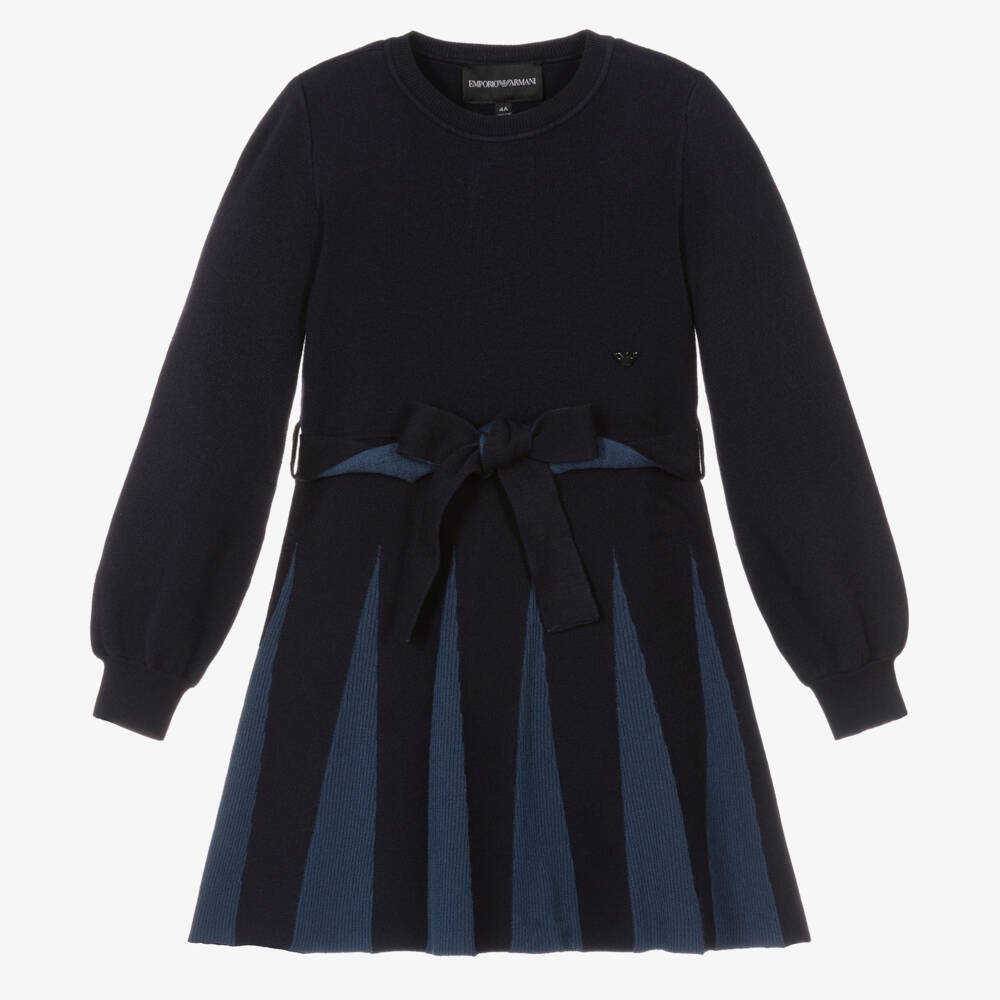 Navy blue dress for girls by Emporio Armani, knitted in beautifully soft cotton. It has a small black Eagle logo charm on the bodice and light blue pleated detailing on the skirt. A co-ordinating sash belt around the waist cinches in the waist for a simple, yet feminine shape.