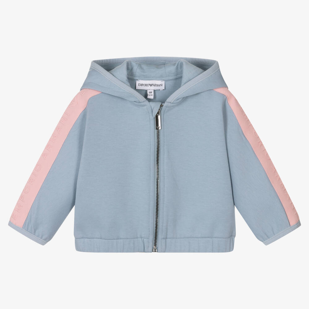 Pastel blue jersey zip-up top for little girls by Emporio Armani, made from a soft and stretchy cotton blend. Sporty with relaxed sleeves, it has pink Emporio Armani logo tape trims on the arms and a branded zip front. The elasticated cuffs and hem ensure a comfortable fit.