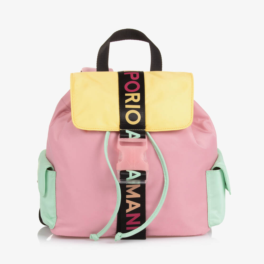 A fun pink backpack for girls by Emporio Armani, made in silky smooth fabric. The main compartment has a drawstring fastening and a small inside pocket for coins or cards. A yellow flap and green velcro pockets on each side give a playful finish. The brand name is printed in contrasting colours for instant recognition.