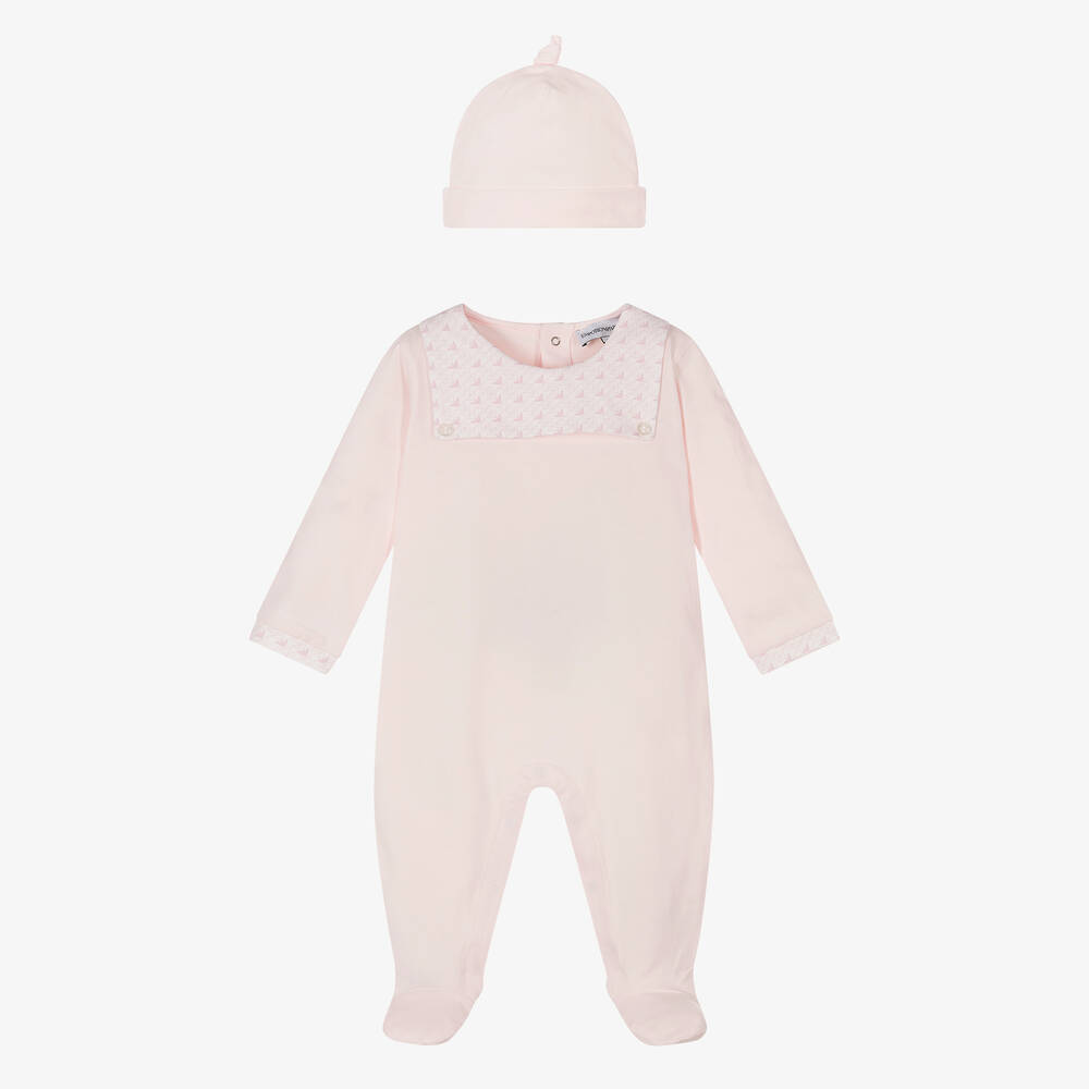 Adorable pink babygrow and hat set for girls by Emporio Armani, made in soft cotton jersey for gentle-on-the-skin comfort. Adding a discreet designer touch, the bib-style collar has a pink Eagle logo pattern, with decorative, branded buttons in each corner and matching trim on the cuffs. It fastens with poppers on the back and between the legs and the matching layette hat is made in a cosy double layer with a sweet turned up brim and knot detail.