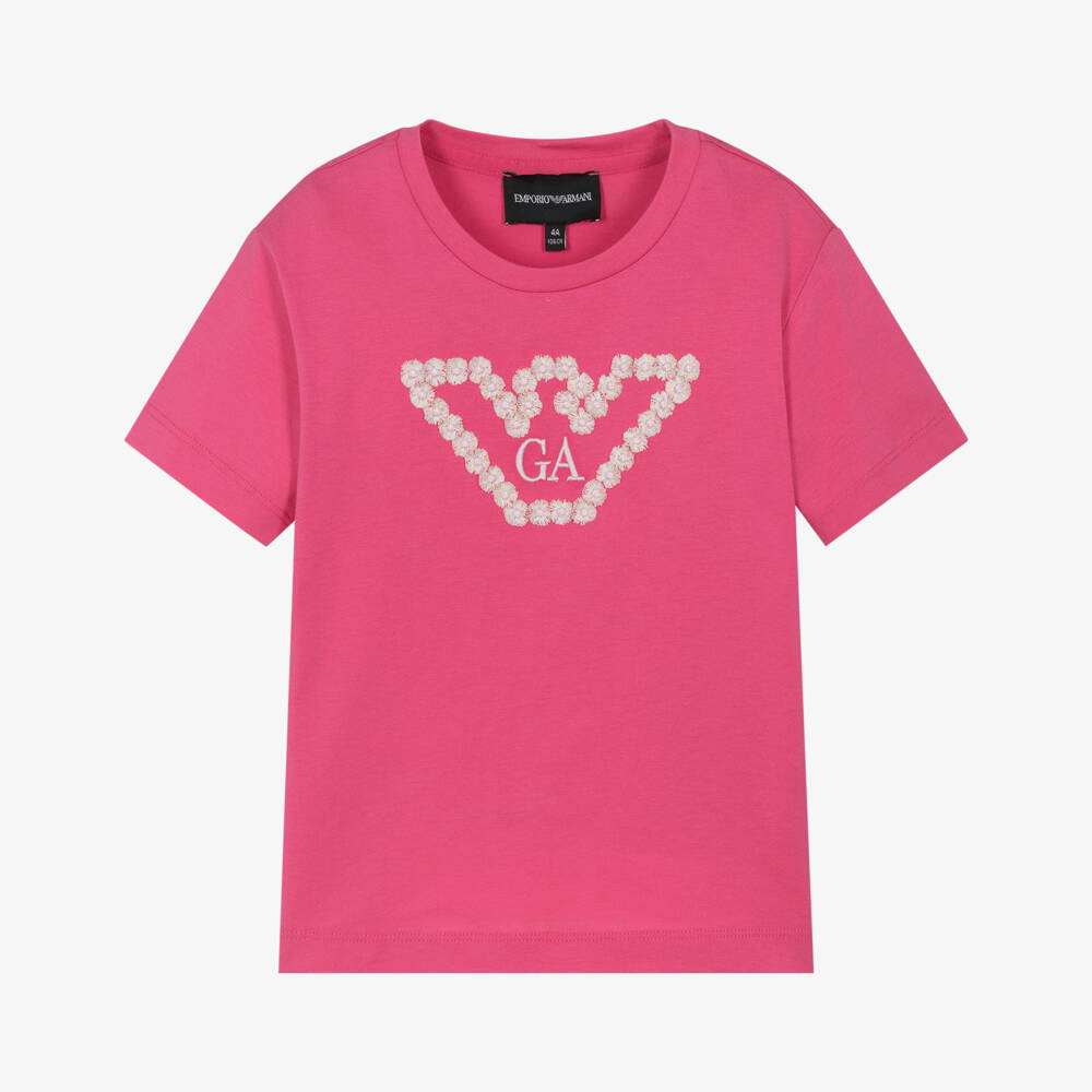 A fuchsia pink T-shirt for girls by Emporio Armani, with the brand's signature Eagle logo appliquéd on the front with embroidered, 3D daisies. Made in soft, comfortable cotton jersey, this lovely tee also has the designer's embroidered initials for instant brand appeal.