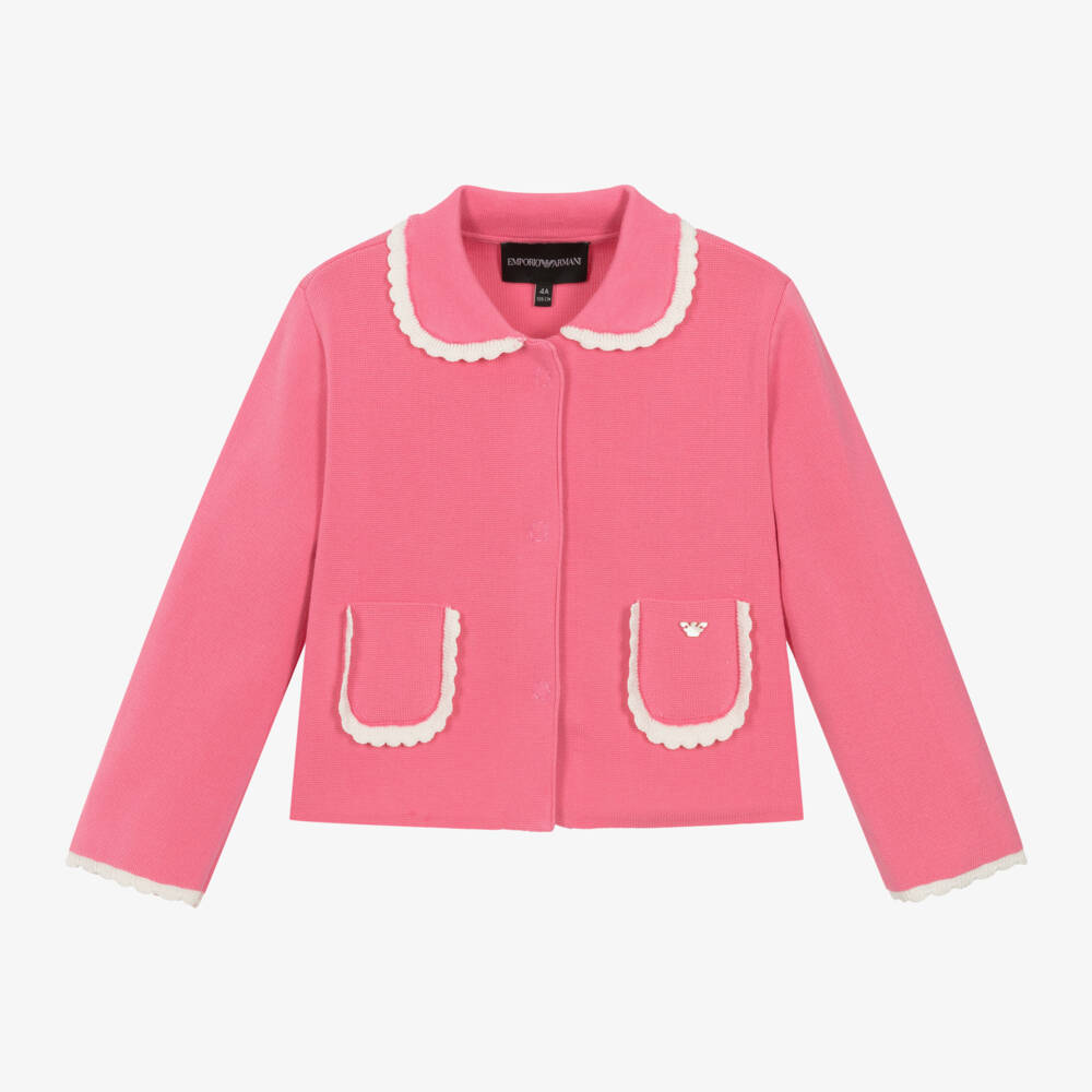 An elegant pink long-sleeved cardigan for girls by Italian brand Emporio Armani. It is made in a luxurious soft cotton knit, with white scalloped trims adding a pretty and feminine touch. Fastening with concealed poppers down the front, it has two patch pockets, one trimmed with a pearlescent Eagle logo charm for an understated designer finish.